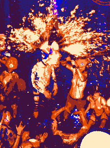 FIREFILM A film projector augmented with class-c firworks (saxons on the reels, gerbs around the lens and lamb housing) is displayed throughout the week prior to the performance. Sheets of nitrocellulous paper fill a glass jar next to the projector. A silver imprint on each sheet reads "My film is about:" A nearby marker allows participants to submit their ideas on the paper and insert them in a hole on the projector, where a small sign reads. "Insert film ideas here. WARNING: Your film idea is for public consumption. Screening this Saturday March 16 at midnight, location TBA." On the night of the performance, the pieces of paper are attached to the large cloth screen, where they are displayed for several minutes to be read by the audience. After spectators/readers have retreated to a safe distance, the projector is turned on, projecting the words, "LUX MUNDI" on the screen until the film melts. The wheels and gerbs are then ignited, casting sparks which ignite the nitrocellulous sheets and the cloth screen beneath them. |