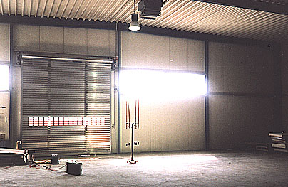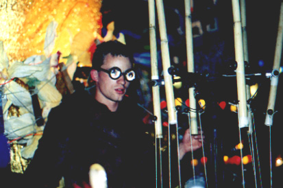 Antenna 2 is a nine foot tall device, performed upon by manipulation of six waving bamboo rods, sticking up into the sky. The memory of sound and the process by which sound is activated are the result of custom electronics. The sound is heard variably through six surrounding speakers.