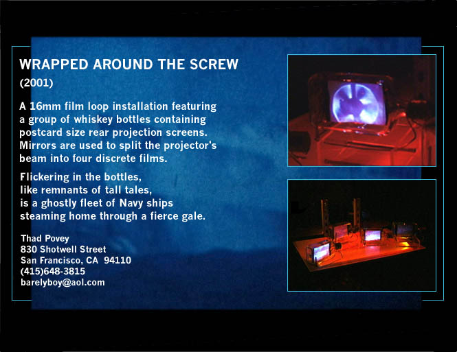 As the founder of The Scratch Film Junkies, he and his collaborators explore the physical realm of hand-manipulated filmmaking. This celluloidal quilting bee has created on-stage projections for a Soul Coughing national tour and film projection/live music projects with Mark Growden and Ramona The Pest. Venturing into three dimensions, Povey created a film-loop device commissioned by San Francisco's Cinematheque for their 40th anniversary. Titled Wrapped Around The Screw, the piece starts with the idea of a hand-crafted ship-in-a-bottle and finds a cinematic counterpart. Other film work includes designing and building a time machine for Craig Baldwin's Spectres of the Spectrum and working as an editor for Werner Herzog's forthcoming feature Invincible. Thad currently teaches Experimental Filmmaking at the Academy of Art College in San Francisco. "The two exemplary shows of 2000 that rocked my world and justified my love - make that masochism - of the margins: Animal Charm's wild-ass, wigged-out, red-hot live video remix of bad '80's TV; and the deliriously delicious duet between accordionist Mark Growden and the eye-popping emulsion experiments of Thad Povey's Scratch Film Junkies. New wine in old bottles!" Craig Baldwin, filmmaker and programmer at the Other Cinema (San Francisco Bay Guardian) |