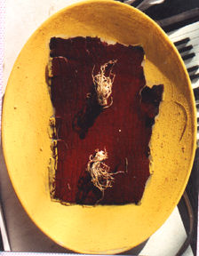 10"x8" pyrex plate, paint, old book-cover material, scallion ends