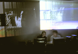 current performance-based activity as vjFutureWorkerGirl began when I felt a need to extend my practice more directly into the social fabric--- in terms of collaborating with other artists as well as responding to the energy of the audience. I use a Videonics MX-1 video mixer to combine video materials on-the-spot, as accompaniment to live music and other performative activity. I approach the projection screen as a stage for moving visual poetry, mixing my own digitally altered recordings with material appropriated from the well of existing moving images. My live video performances have ranged from solo gigs accompanying DJs to fully choreographed works such as the Nine Questions performance, a collaboration with dancers, live musicians, and shadow puppeteers, where we played to an audience of 1,700 people at the Ann Arbor Film Festival. My partner Jason Jay Stevens and I perform together as “Potter-Belmar Labs,” creating improvised cinematic events with live mixes of video and audio. This work examines of the art of storytelling. As we disassemble the traditional components of narrative, our current focus is on characters and settings. o |