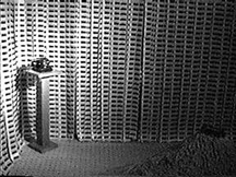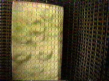 16mm filmloop of white bloodcells projected onto screen made of a showercurtain & plastic motorcycle light covers-- this is the way into the back room, which is full of plexi-mirror and many more filmloop projections of same footage