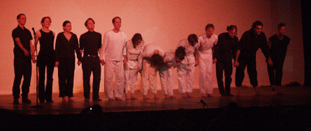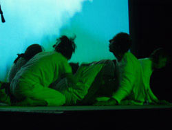 ![]() Jason Stevens, puppeteers Naia Venturi, Leslie Wolfe, Kirk Kitchen dancers Moody Andrews, Stefanie Cohen, Cara Graninger, Akasha Fluegge, Ben Rouse, Robert Hughes percussionists Misha LeFey, Aryeh Lerman-Sinkoff, Jbird VJ Future Worker Girl not pictured A five-member version of the Collective performed the forty-minute work, 9QV2, at the Immedia03 exhibition of the digital arts at the University of Michigan. Nine Questions got its start in November of 2002, as a 55-minute multimedia composition performed at Dreamland Theater