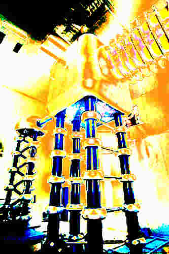A grand Public Work such as this is required for the study of the constituents of Matter. Models are tested and paradigms are refined in artificial conditions of the simplest terms however complicated to achieve. The researchers, scientists, and engineers of Fermi orchestrate atomic events in an otherwise empty space, encouraging rare occurrences into relative commonality, magnetically harnessing the quiverings of matter, allowing those to splatter, by smashing them together, releasing Tiamat, the dragon goddess of Chaos, and--like trying to sketch smoke swirling in the wind--they trace her many paths as she flies out, in all directions, to be reabsorbed by the Cosmos, gone as quickly as she had come -- split seconds. The racetrack of Chaos, the path of fated Matter, is a huge, curled void, encased in narrow channels. The path begins for two clumps of atomic material at the Cockcroft-Walton accelerator, a shining archetype of mid-20th Century Futuristic-ness, at home in its polished tiled chamber. From here, our experimental bullets dive into the four-mile Tevatron hoop, buried beneath a perfectly circular river -- a queer site, and all that is visible to our eyes from above the prairie. In the tunnel of the Tevatron, the contents are rolled increasingly faster by the pulsing gradients of quadrupole magnets to a speed a mere 200 miles per hour shy of Light itself. Two miniscule missiles, one of Matter, so familiar to us in its myriad forms, comprising our Reailty, the other is of Anti-Matter, an alien like no other in our Universe. |